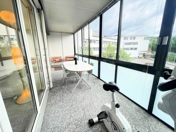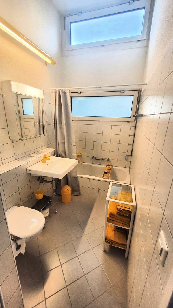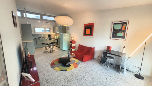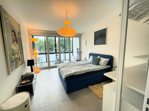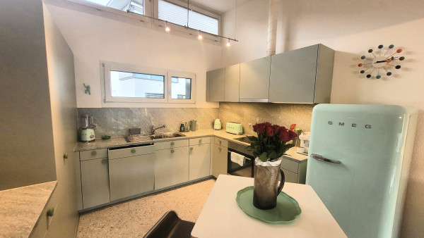 Diese geschmackvoll eingerichtete 2.5-Zimmer-Wohnung überzeugt mit einer durchdachten Raumaufteilung und einem modernen, stilvollen Ambiente. Die offene Wohnküche mit hochwertigen SMEG-Geräten und eleganter Steinabdeckung bietet viel Charme und Funktionalität. Das helle Wohnzimmer sowie das gemütliche Schlafzimmer öffnen sich zur verglasten Loggia – ideal als zusätzlicher Ess- oder Arbeitsbereich mit Blick ins Grüne. Das Badezimmer ist kompakt und gepflegt, mit Badewanne und ausreichend Stauraum. Harmonisch abgestimmte Farben und Designklassiker sorgen für ein einzigartiges Wohngefühl.