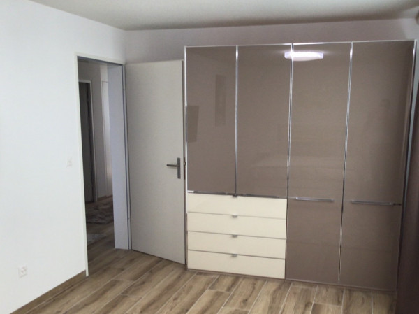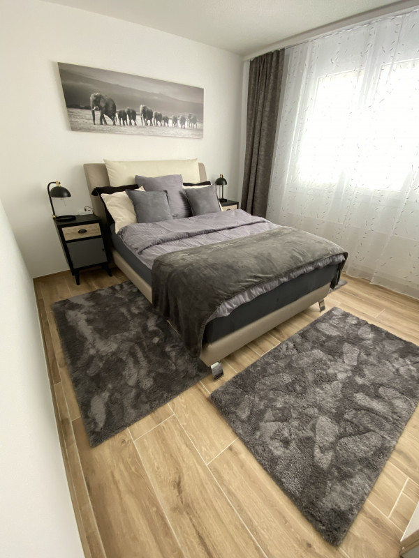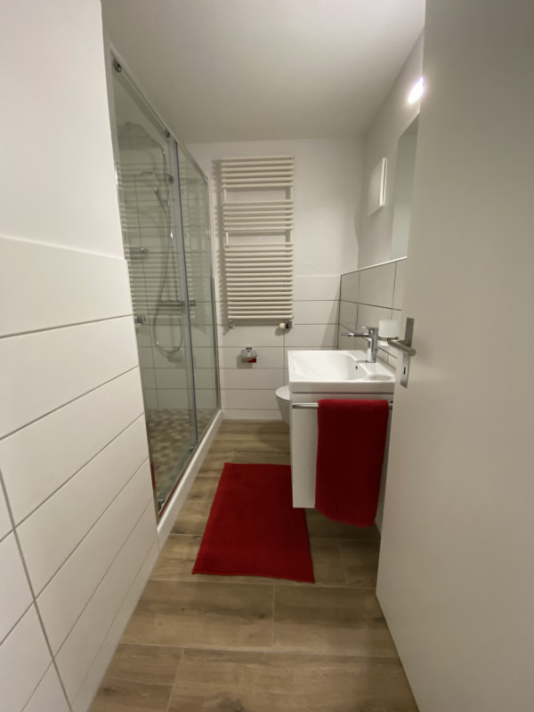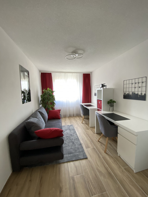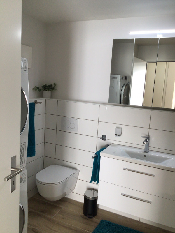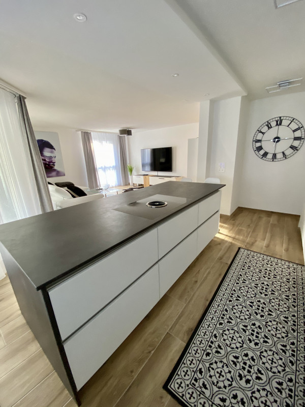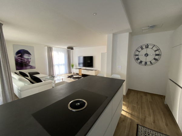 The apartment has a spacious and well sunny balcony ( 20 m2) with a view into the forest and over the adjacent agricultural zone, which therefore also invites for a glass of wine after work. The beautiful and exclusive flat offers 2 bedrooms, 1 of them with TV, which are equipped with high-quality box-spring beds ( 160 x 200 ) / ( 140 x 200 ) and with exclusive glass cupboards ( 4-door ) with outside drawers. The 3rd room has been converted into a spacious home office with two workstations and a sofa that can be converted into a guest bed. In addition to the main bathroom with shower/bathtub and washing tower, there is also a separate guest toilet with shower. The fully equipped, open-plan kitchen with cooking island includes a crockery set for 6-8 people, sufficient glasses, pans, pots, cooking and baking utensils, toaster, kettle and a Nespresso machine to make getting up in the morning easier. The absolute eye-catcher of the living room is the modern and cosy effect fire. Throughout the flat, unlimited high-speed internet and TV connection is available for your free use. The electrical setup is completed with a Smart TV.
