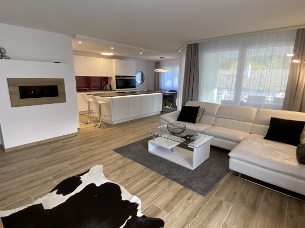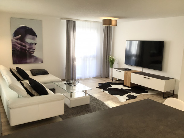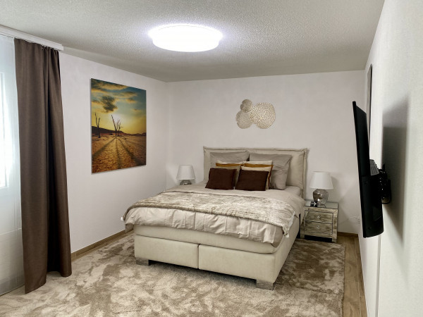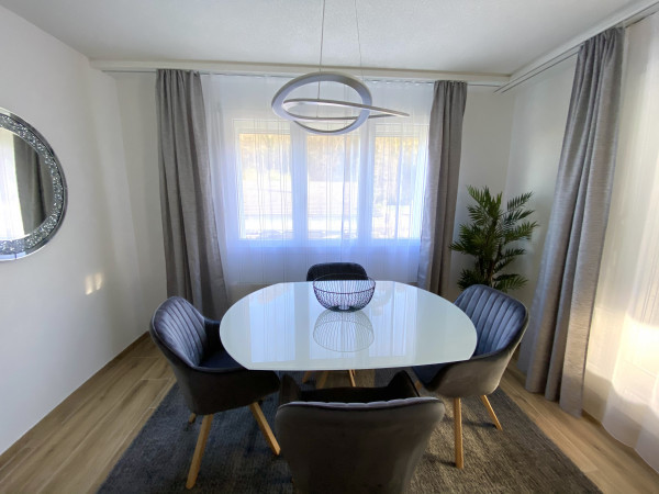 This high-quality renovated, modern and tastefully furnished 4.5 room apartment ( 110 m2 ) is located in Dietikon ( ZH) in a suburb of Zurich City with excellent transport connections. The furnished apartment on the 1st floor is located in an exemplary residential area with all its advantages, directly on the edge of the forest with a beautiful view all the way to Zurich. A jewel is certainly the beautiful and well-maintained swimming pond in front of the house, which invites you to cool off in summer. The shopping centre in Urdorf with Coop, Migros, Denner, hairdresser, beauty centre, clothes dry cleaner, kiosk and indoor swimming pool is only a short distance away. The town of Dietikon and Schlieren are also within easy reach by car or public transport. Zurich's main railway station can be reached in 25 minutes by public transport and in 18 minutes by car. The motorway connection to Lucerne, Zug or Zurich can be reached in a few minutes.